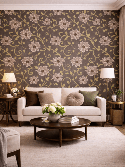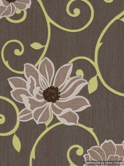 Tapeta ścienna winylowa na flizelinie Rasch – Brązowa z Beżowymi Kwiatami i Zielonymi Pnączami, Zmywalna