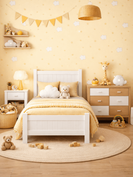 Tapeta papierowa dziecięca – Żółta z chmurkami i gwiazdkami 10m x 53 cm