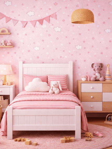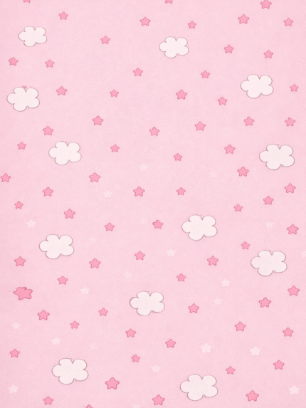 Tapeta papierowa dziecięca – Różowa z chmurkami i gwiazdkami 10m x 53 cm