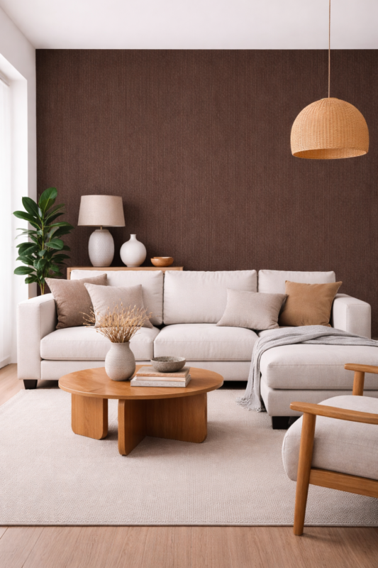 Kolorystyka tapety utrzymana jest w ciepłym, głębokim odcieniu brązu z delikatnymi tonalnymi przejściami, które podkreślają strukturę powierzchni. Matowe wykończenie bez połysku nadaje tapecie naturalny, elegancki charakter i sprawia, że światło miękko rozprasza się na ścianie, podkreślając jej fakturę.