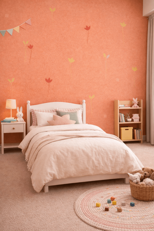 Produkt doskonale sprawdzi się w pokojach dziecięcych, sypialniach, salonach, korytarzach oraz przedpokojach, wprowadzając do wnętrza ciepło, lekkość i przyjazną atmosferę. Łososiowa tapeta z motywem roślinnym łatwo komponuje się z jasnymi meblami, naturalnym drewnem oraz pastelowymi dodatkami.