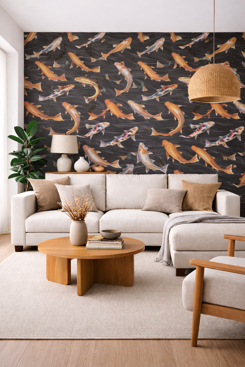 Efektowna tapeta ścienna z realistycznym motywem pływających karpi koi, ukazanych w dynamicznych, płynnych układach. Smukłe sylwetki ryb, przedstawione w różnych kierunkach, tworzą rytmiczną, harmonijną kompozycję, która przyciąga wzrok i nadaje wnętrzu głębi oraz ruchu. Wzór inspirowany jest estetyką sztuki japońskiej, symboliką spokoju, szczęścia i równowagi.